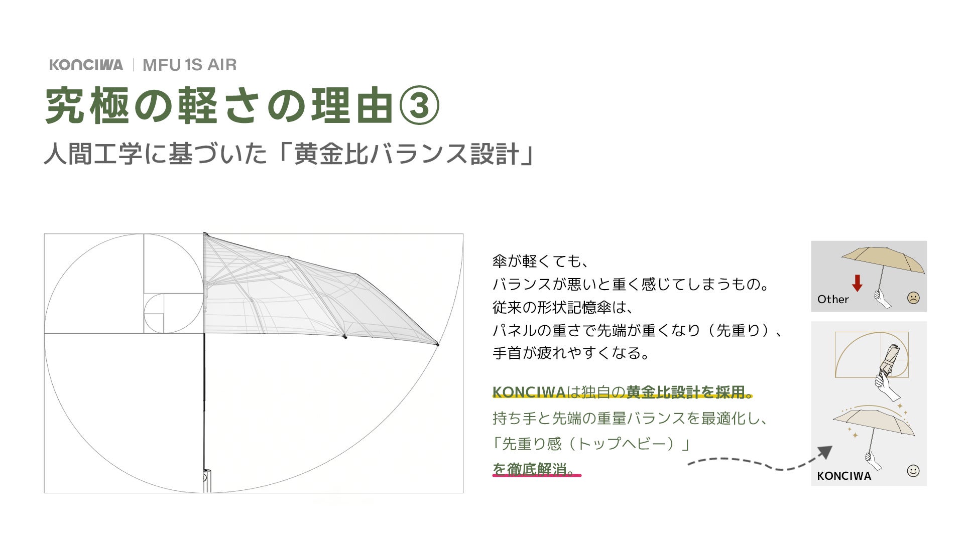 人間工学に基づいた「黄金比バランス設計」:重心を持ち手側に寄せる独自の黄金比設計を採用。手首にかかる負担を徹底的に解消し、数値以上の「軽やかな差し心地」を叶えました。