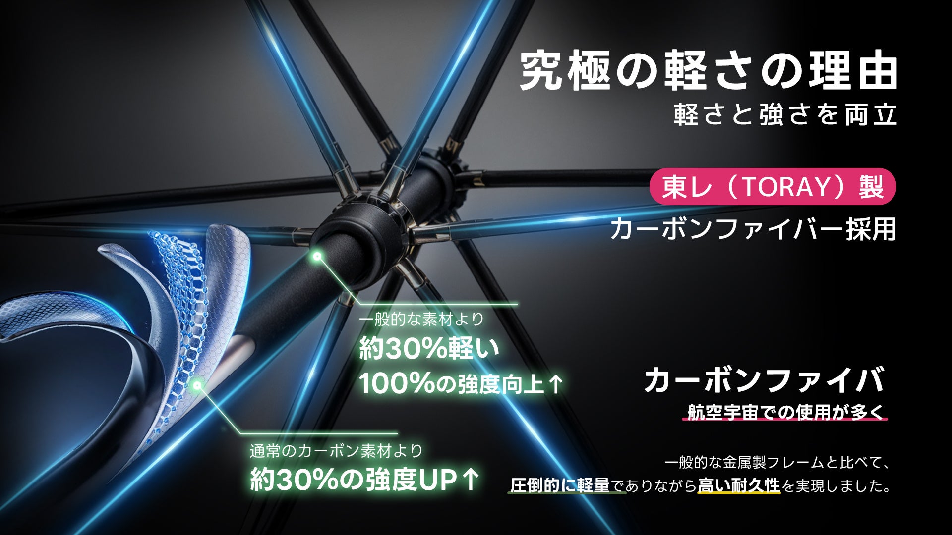 1. わずか200gの軽量設計。カーボンファイバー × 550T極細繊維の融合