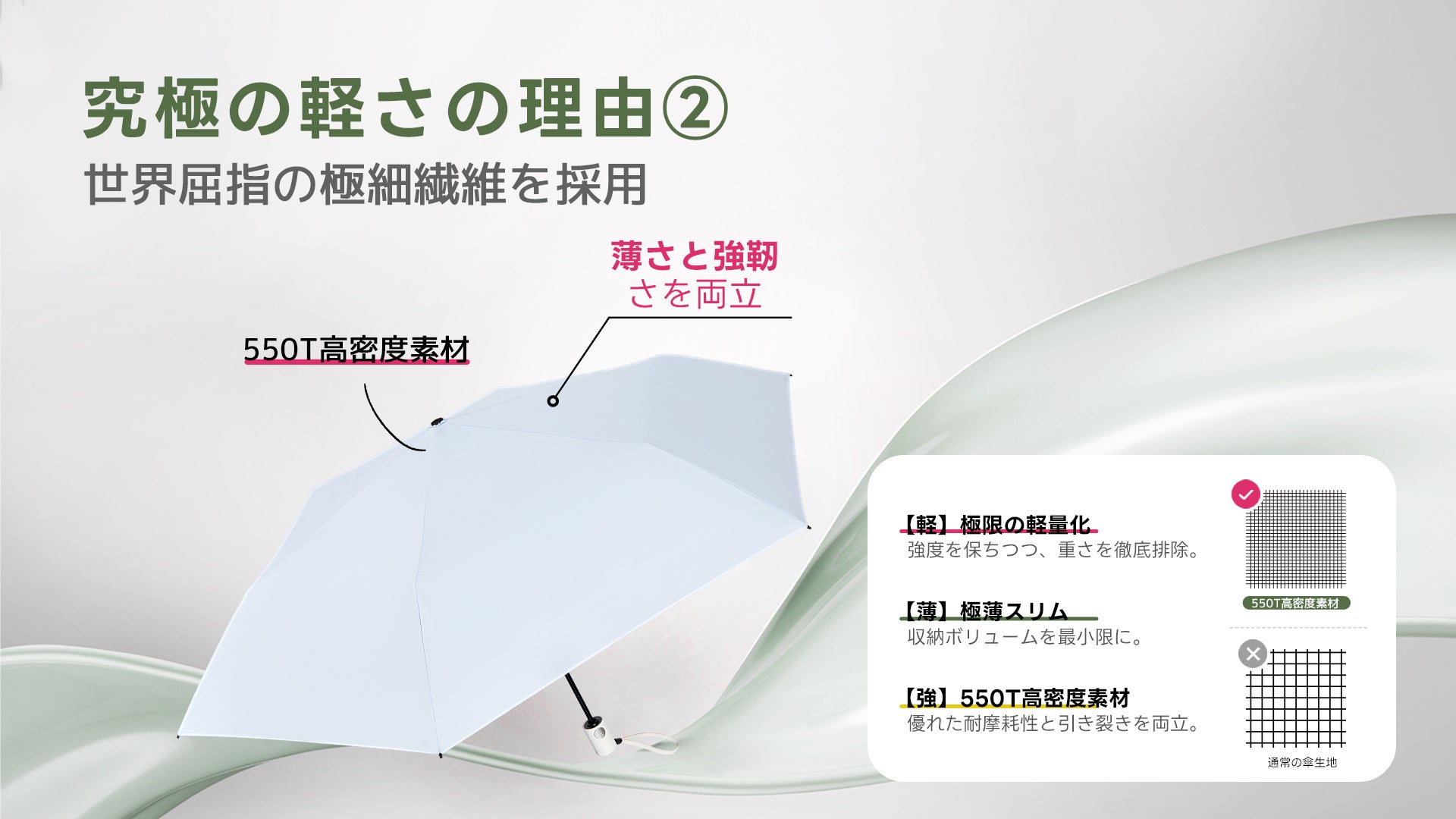 世界屈指の極細繊維「550T高密度素材」:傘布には、驚異的な密度を誇る550T素材を採用しました。極限まで薄くスリムに仕上げることで、収納時のボリュームを最小限に。圧倒的な軽さと、高級感のある質感を両立しています。