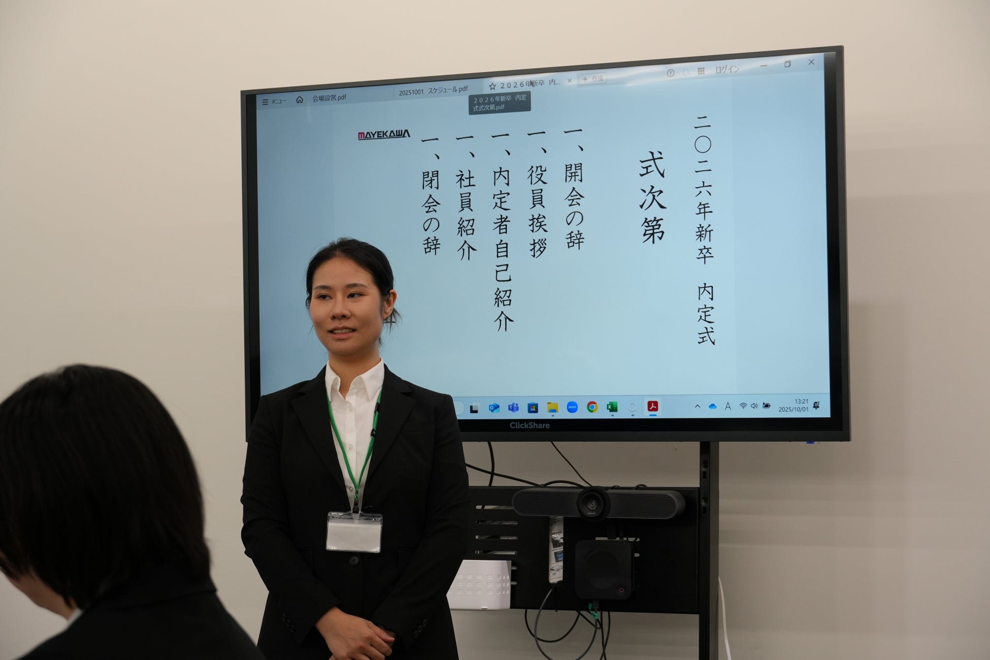 「内定式を終え、いよいよ皆さんと同じ仲間として歩んでいけることにワクワクしています。当社には皆さんが力を発揮できるフィールドが広がっています。ぜひ、これからの時間で“自分はどんな社会人になりたいか”を考えながら準備を進めていただければと思います。春にお会いできる日を心待ちにしています。」