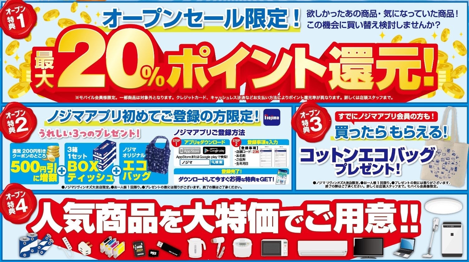 また、ノジマでは10月24日(金)~11月14日(金)の期間中、オープン限定特価としてノジマポイントが20%還元になるお得なセールも開催いたします。皆さまのご来店をお待ちしております!