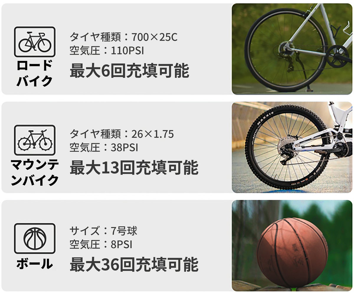 コンパクトサイズに1,200mAh×2超大容量バッテリーを搭載。マウンテンバイクの場合、フル充電では約13本のタイヤに空気を入れることが可能(※0PSIから38PSIまで)!