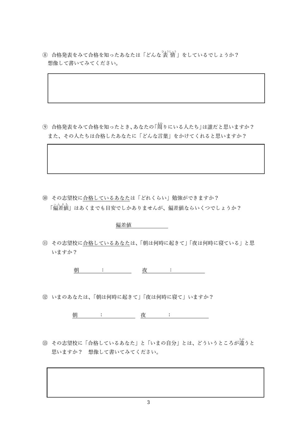 本勉強会では、いきなり完成形の体験記を書くのではなく、段階的に思考を整理できるワークシートを用いて進行します。 まずは、自分の目標や志望校を目指す理由を言語化し、思考を整理することからスタートします。 その上で、合格した未来の自分を具体的にイメージしながら、「未来合格体験記」の作成へと取り組みます。 このプロセスを通じて、目標が単なる憧れではなく、日々の学習行動に落とし込まれた“実行可能な計画”へと変わっていきます。