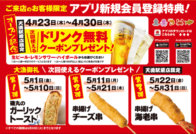 磯丸水産 天満駅前店も「酒場」に?!【ドリンク全品399円】メニューも一新!安くて旨い『磯丸酒場』が大阪に誕生4月23日(木)16:00 グランドオープン!!