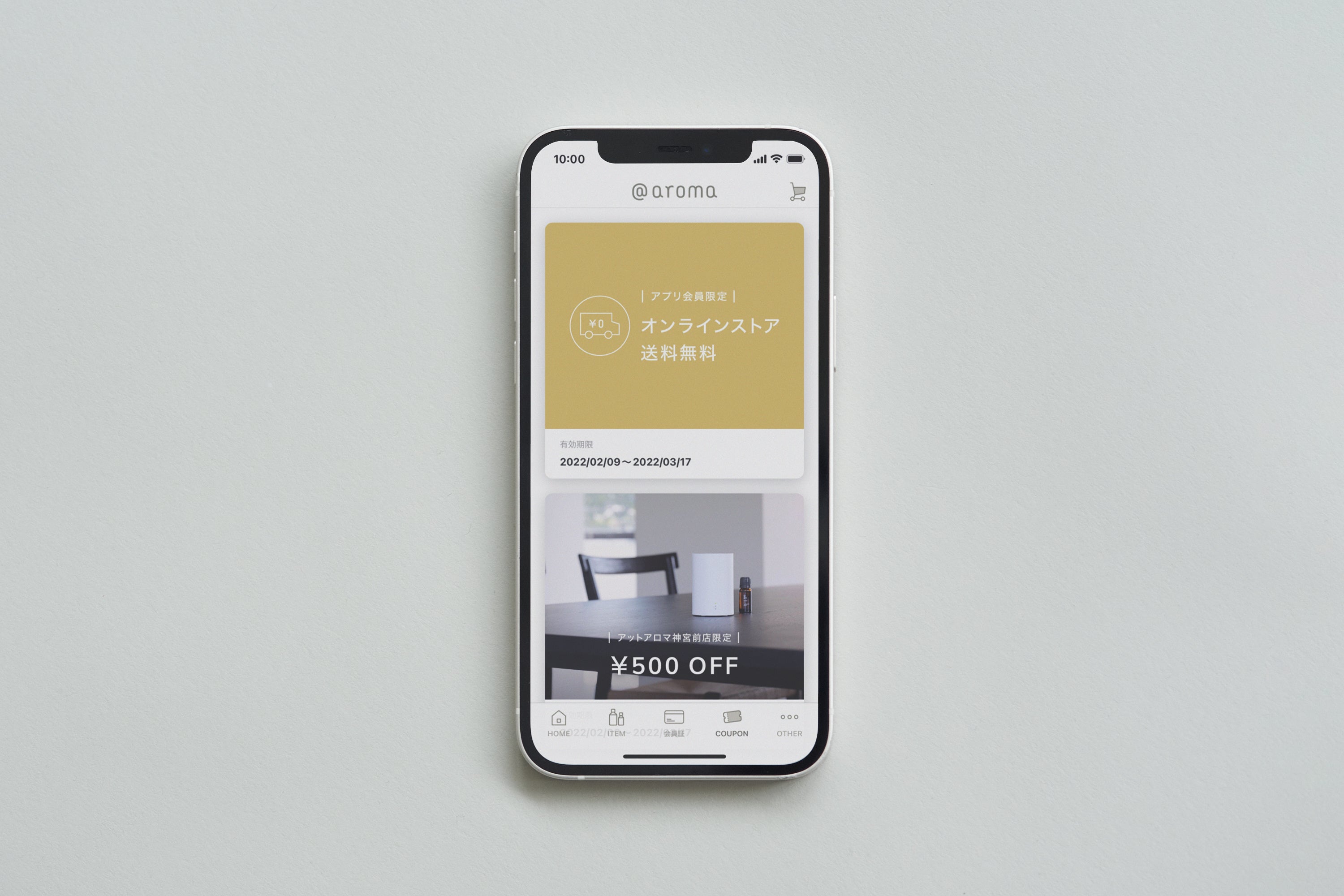 アットアロマ公式アプリをダウンロードいただくと、全国の直営ストア、オンラインストアでのお買い物に使える500円OFFクーポンをもれなくプレゼントいたします。