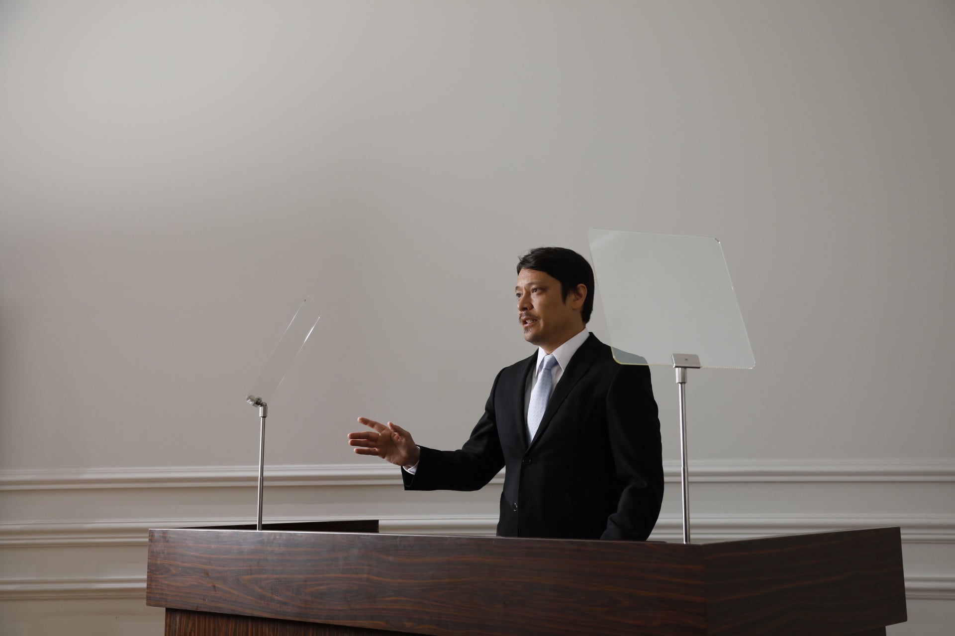 演説の際にスピーカーの前に透明な板(ハーフミラー)を置いて、聴衆に対して視線を落とすことなく話を伝えることが出来るスピーチプロンプター。「原稿を覚える時間」を「演じるための練習時間」に替え、充分なリハーサルをすることで、「聴衆と心が通じ合い、伝わる」スピーチを実現できます。