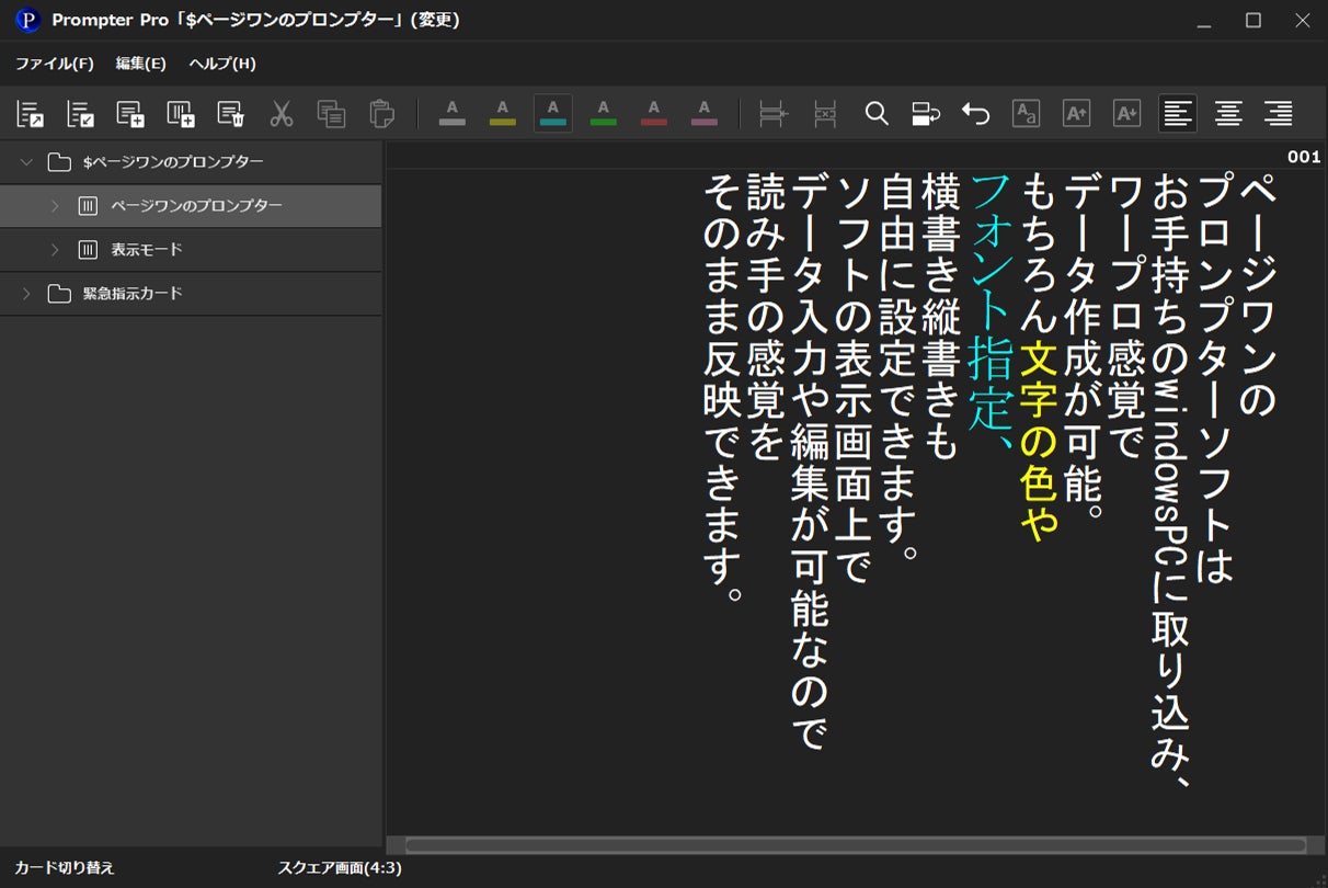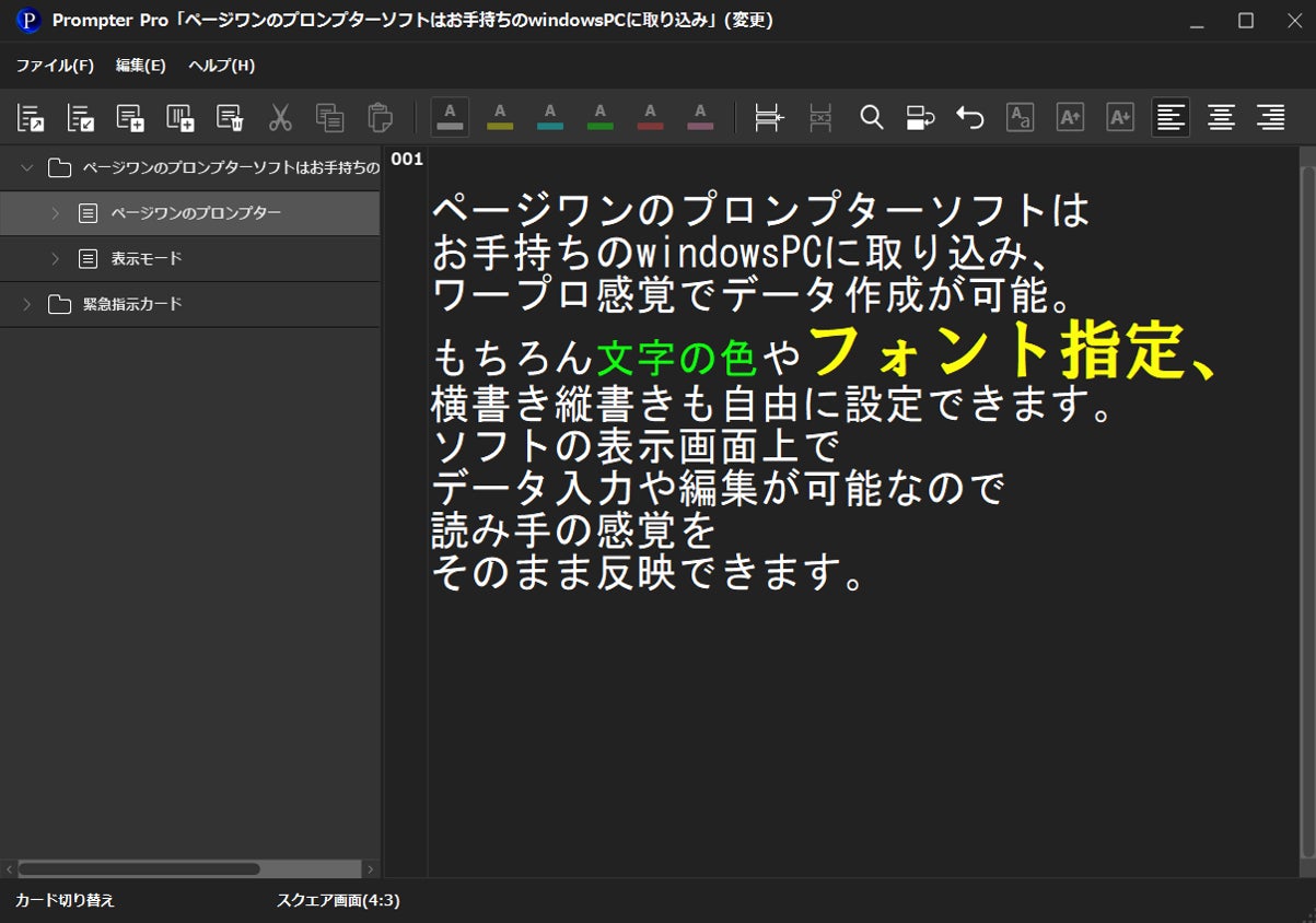 ページワンのスピーチプロンプターソフトウェア『Prompter Pro』の特徴は、スピーカーの話すタイミングに合わせてオペレーターが原稿を表示できるページワン独自の「カード式表示機能」を搭載していることです。どなたでもプロンプターが簡単に使えるように設計されており、豊富な機能を有しています。