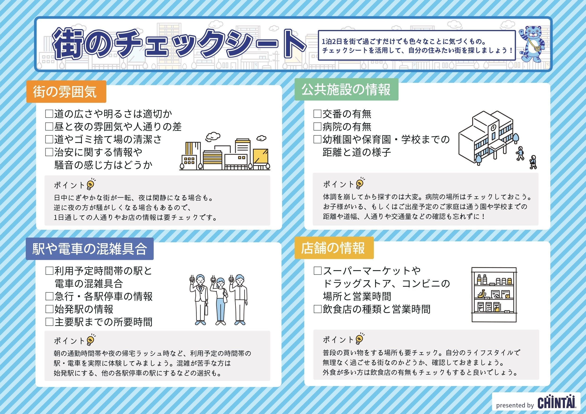 CHINTAIホテル暮らしは、引越しをする前に知っておきたい街の情報や利便性などをホテルに数日間滞在し、その街での生活を行うことで引越す前と引越した後のギャップを減らすためのサービスです。