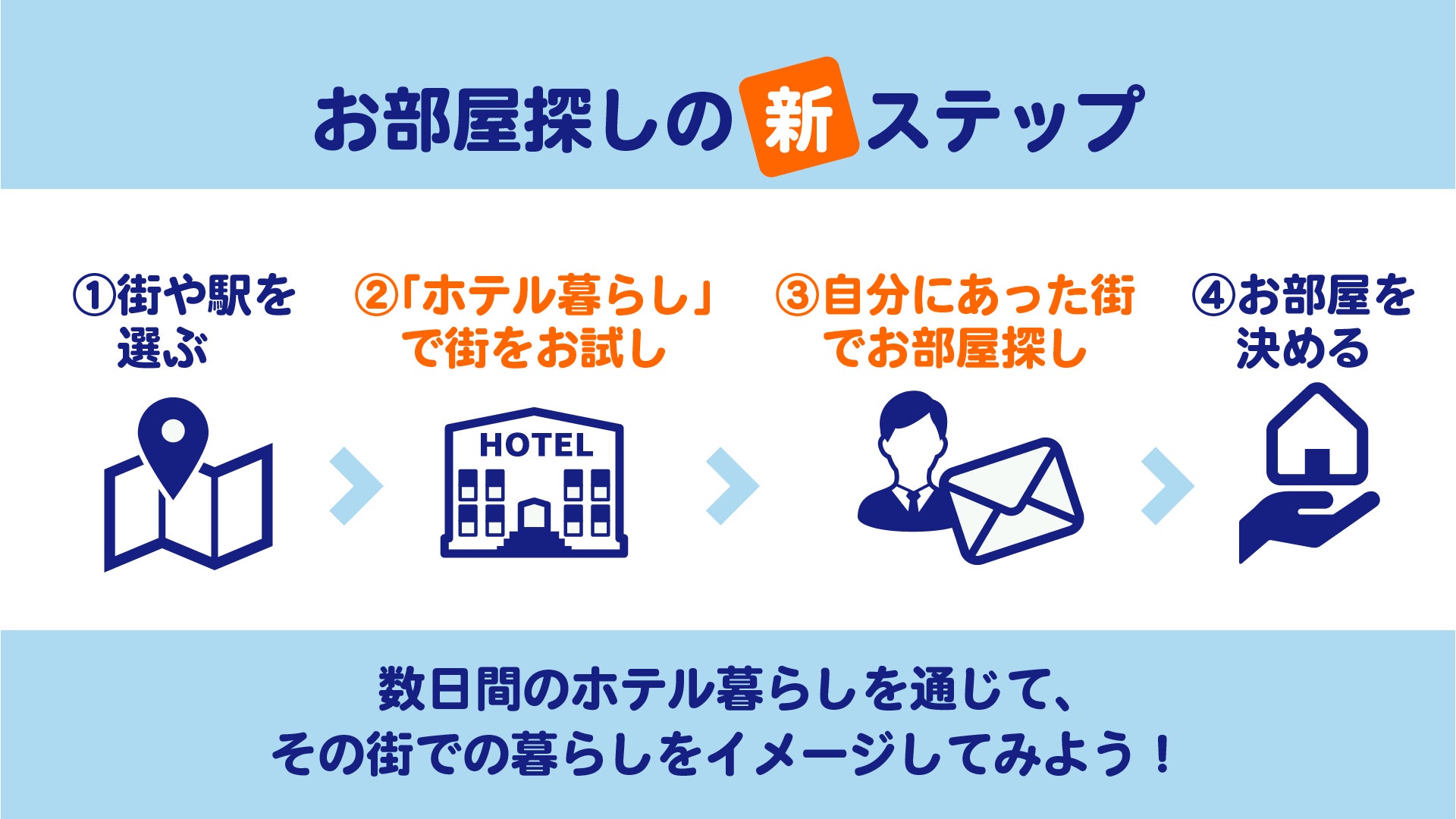 掲載されている街は、住みたい街ランキング上位の街や主要駅・街を中心にピックアップしています。また、掲載されているホテルはランドリーやWi-Fiが完備され連泊・長期滞在プランがあるホテルを中心に掲載しております。遠方からの引越しの場合、内見できる件数も限られてしまいますが、ホテル暮らしを活用することで街を体験しながら借りるお部屋を探すこともできます。