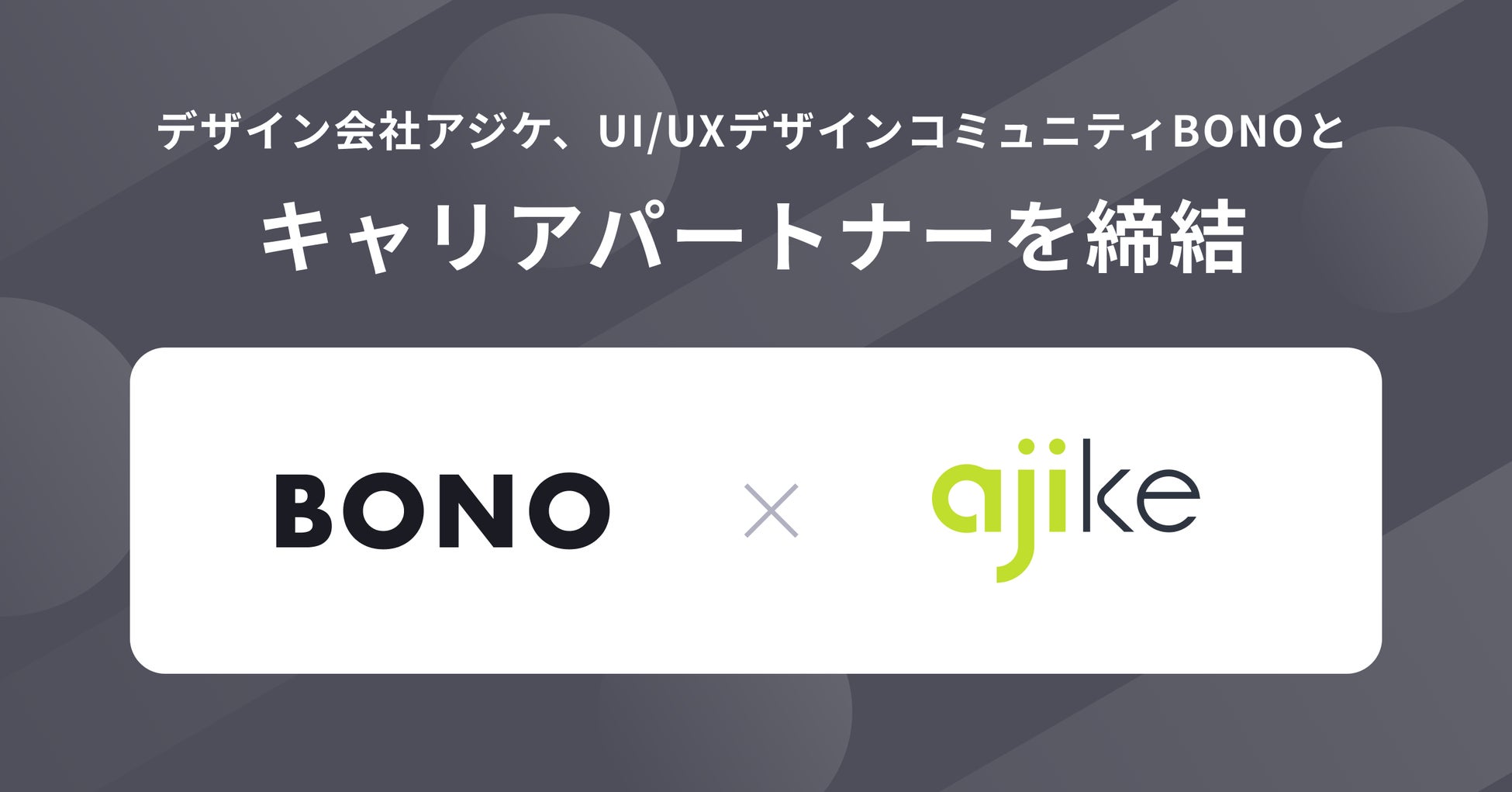 UXコンサルティング、事業デザイン、UI/UX改善などを手がけるサービスデザイン会社の「株式会社アジケ(本社:東京都目黒区、代表取締役:梅本周作、以下:「アジケ」)」がプロと学べるUIとUXのデザインコミュニティ「BONO(代表:甲斐琢巳、以下:BONO)」とキャリアパートナーを締結いたしました。