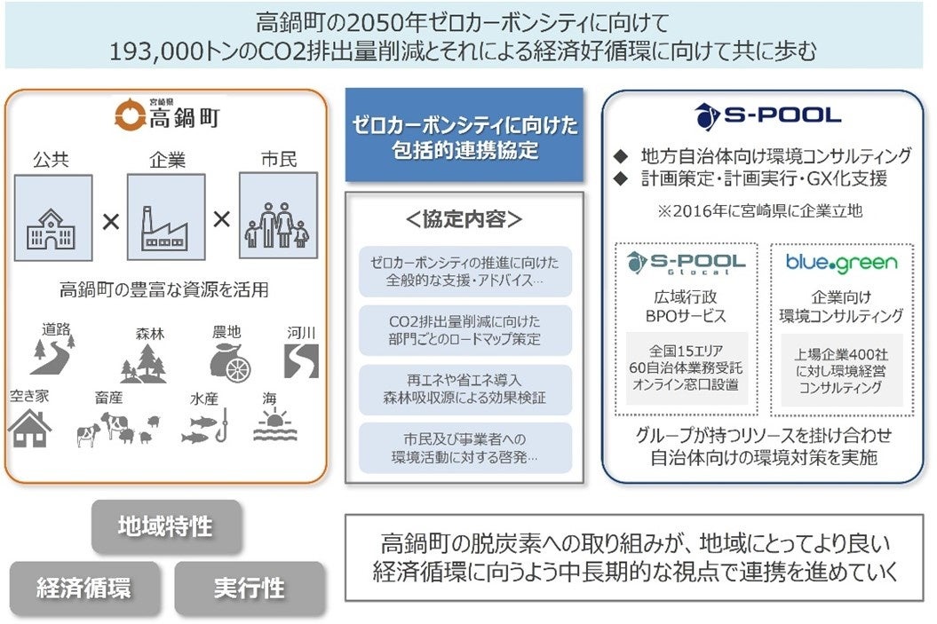 本協定では、高鍋町のゼロカーボンシティ実現に向けた推進計画策定および実行の支援を行ってまいります。具体的には GHG 排出量等の算定や削減に向けたロードマップの策定、各種施策の効果検証、持続的なまちづくりに向けた地域資源の活用調査、町民及び町内事業者への環境活動に対する啓発活動等を行ってまいります。