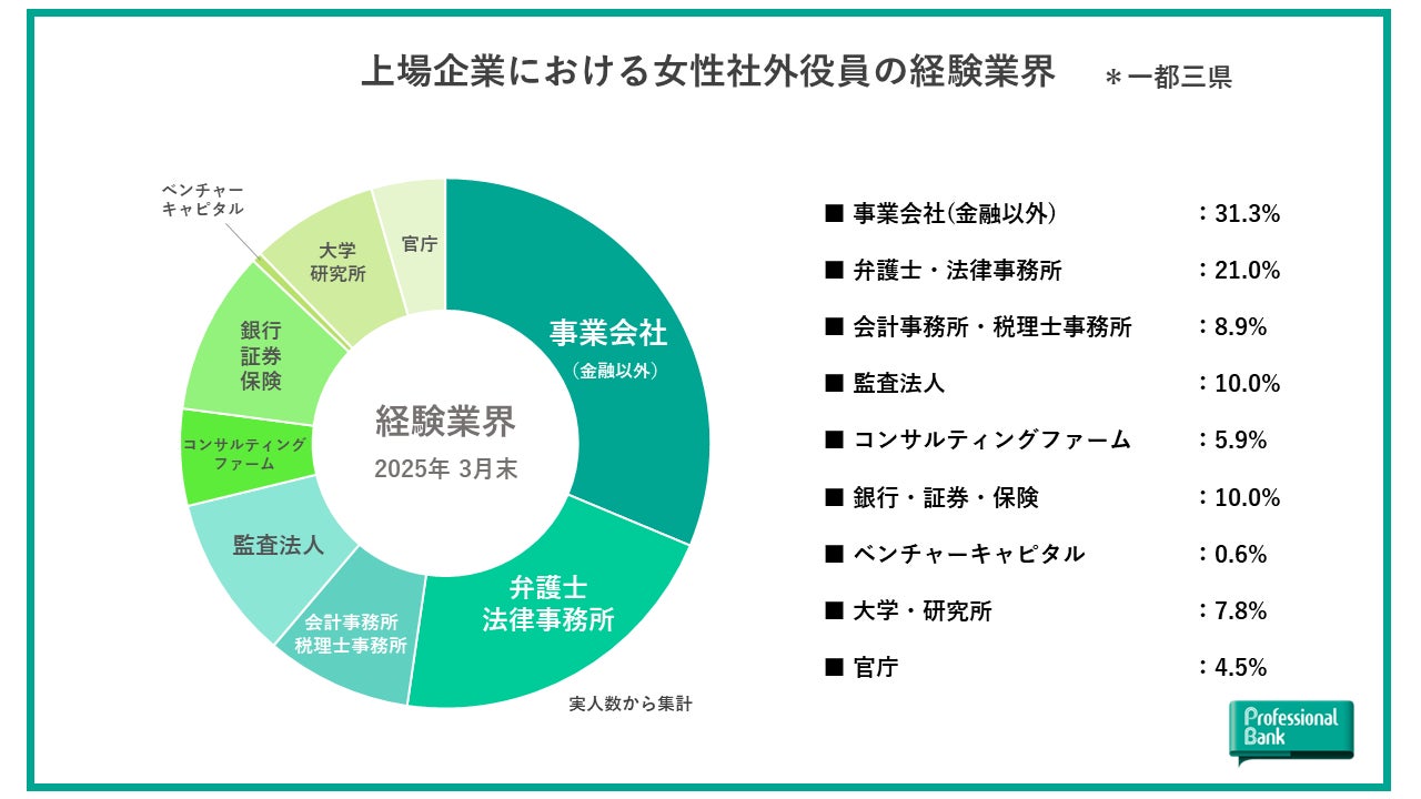 2025年3月末時点での経験業界は、事業会社経験者(金融以外)が31.3%で最多となりました。また、弁護士・法律事務所経験者、会計事務所・税理士事務所経験者、監査法人経験者といった士業系専門人材は合計で39.9%となり、女性社外役員の約7割を事業会社経験者と士業経験者が占める結果となりました。 ※4