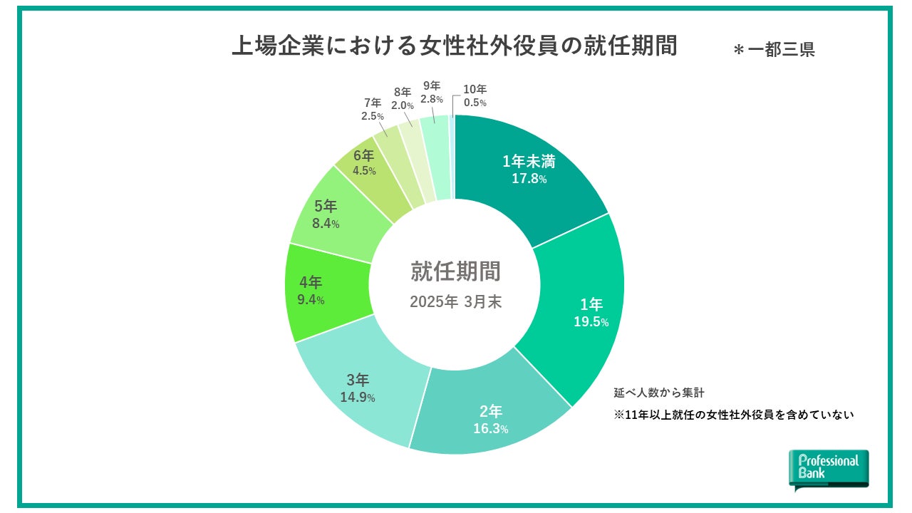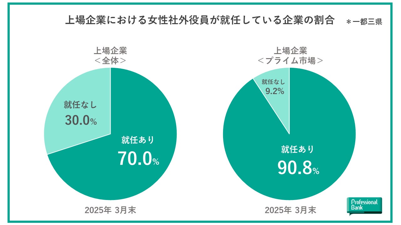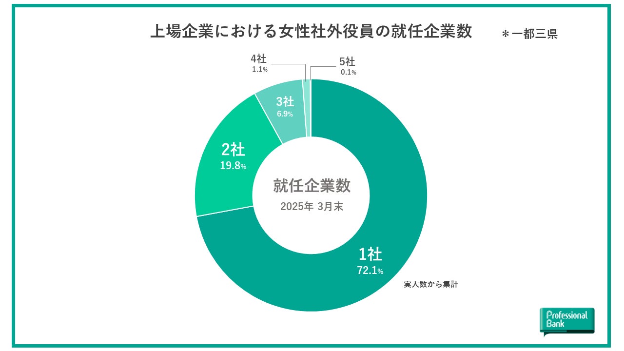 株式会社プロフェッショナルバンク(本社:東京都千代田区、代表取締役社長:呑田好和)は、上場企業の女性社外役員の属性や志向性をデータベース化した独自の「現役の女性社外役員データベース」をもとに、一都三県の女性社外役員の就任動向・傾向の分析を行いました。