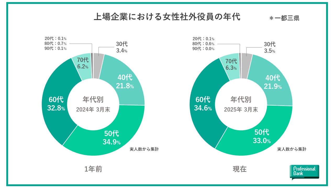 2024年3月末からの増加数は、60代が最も多く1.2倍増の134人増加、次いで40代が67人増加、50代が65人増加と続きます。女性社外役員の約7割を占める50代・60代の増加数に加えて、40代の女性社外役員の増加が目立ちました。