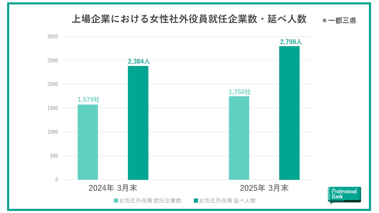 多くの上場企業が2024年度の決算を迎えた今、プロフェッショナルバンクでは2024年度と2023年度の同時期(3月末時点)を比較した、一都三県の上場企業における女性社外役員の就任動向・傾向の分析結果をお伝えします。 ※1