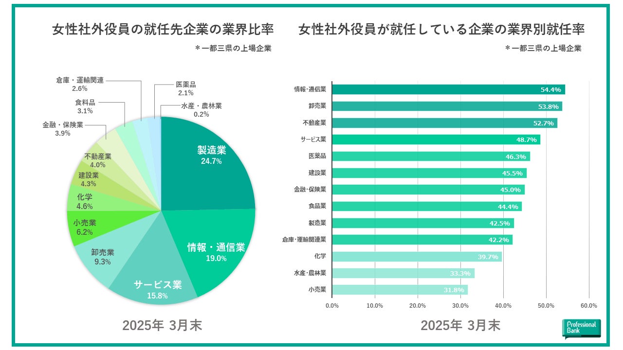 就任先企業の業界比率最多は製造業が24.7%、業界別の就任率最多は情報・通信業で54.4%