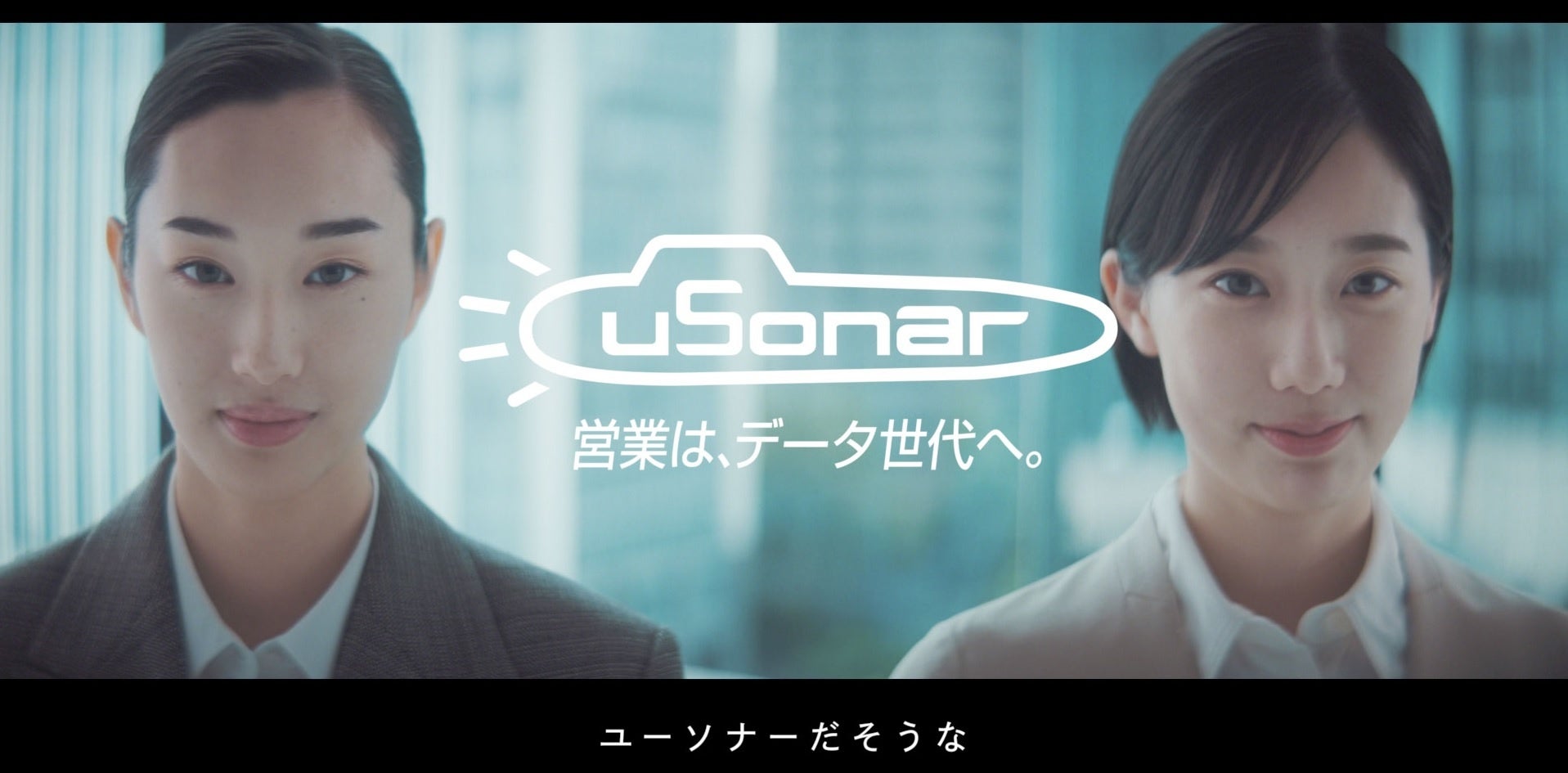 ビジネス街。タクシー内でメイクを直す女性営業2人。余裕を感じさせながら歩く笑顔の2人。いったいなぜそんなに自信が?と振り返るビジネスマン。エレベーターから廊下、プレゼンの席。輝きを増す2人の背にはユーソナーがもつ膨大なデータの海が広がる。ユーソナー。自社保有データを連結させ、結果につなげる。事業所単位までわかる国内最大級データベース。ラストシーンでは「営業は、データ世代へ。」のコピーとともに、印象的な決めセリフが2人の口から飛び出します。