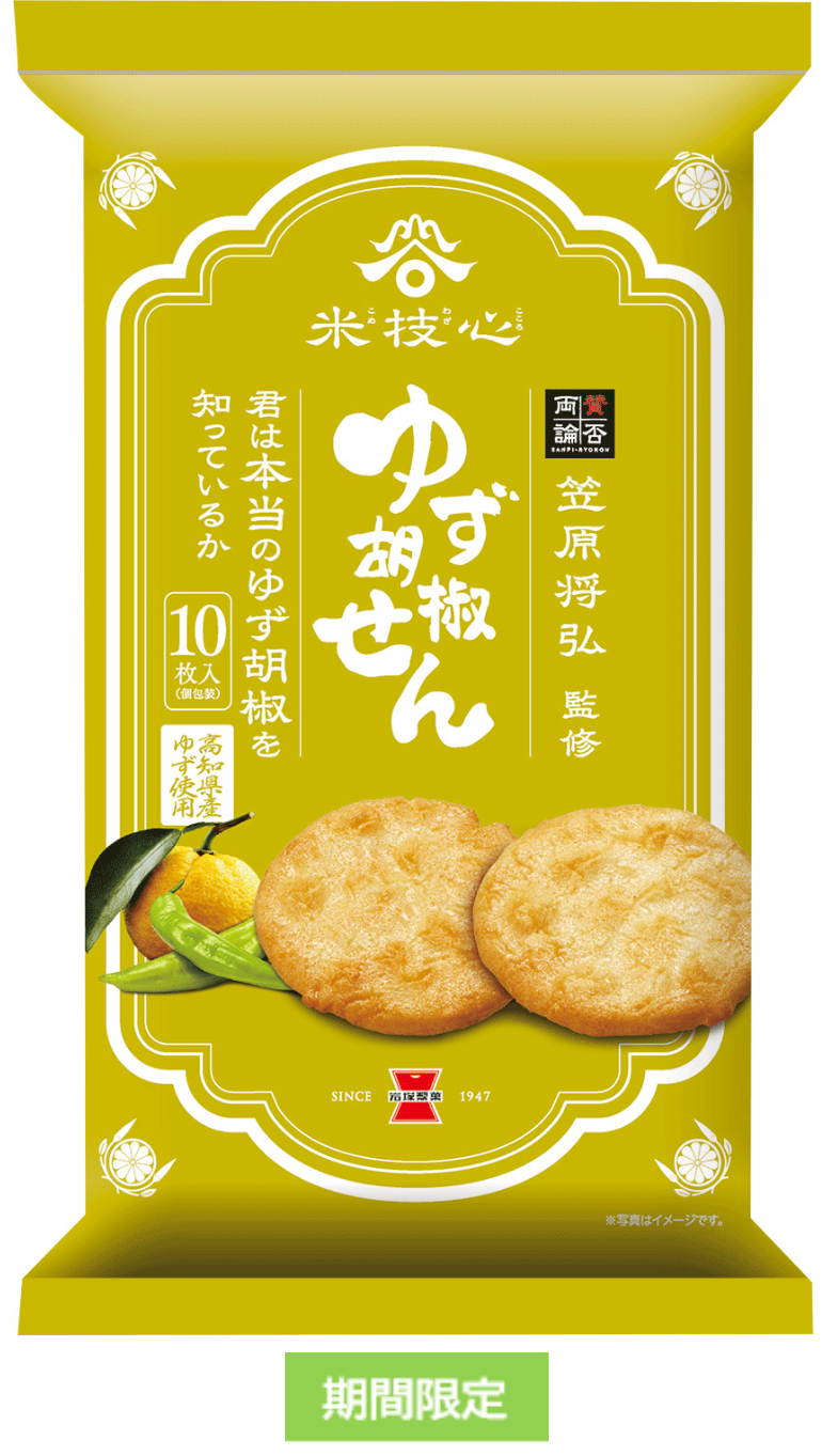 今回新たにコラボさせていただいた3品は、和の料理人である笠原氏監修のちょっと贅沢な味わいが楽しめる本格米菓です。岩塚製菓の米菓の特長である日本のお米を活かした風味と心地よい食感に合うよう、味付け監修をしていただき発売に至りました。新商品の開発に至り、笠原氏は岩塚製菓を訪れ実際の米菓の製造工程を見ていただきました。開発チームとの最終打ち合わせで新商品の試食を行った際には高評価をいただき、『旨塩せん』 では“もう一枚食べたくなる究極の淡味”、『鬼ひび』では“極めすぎた海苔しお”、期間限定の『ゆず胡椒せん』では、“君は本当のゆず胡椒を知っているか”と、 笠原氏からパッケージのコピーもいただきました。挑戦や遊び心を大切にする笠原氏の料理と同じく、奥深さとワクワク感を感じてもらえる商品となっています。笠原氏の“日本料理の味わい”と岩塚製菓の技術を融合させた自信作です。