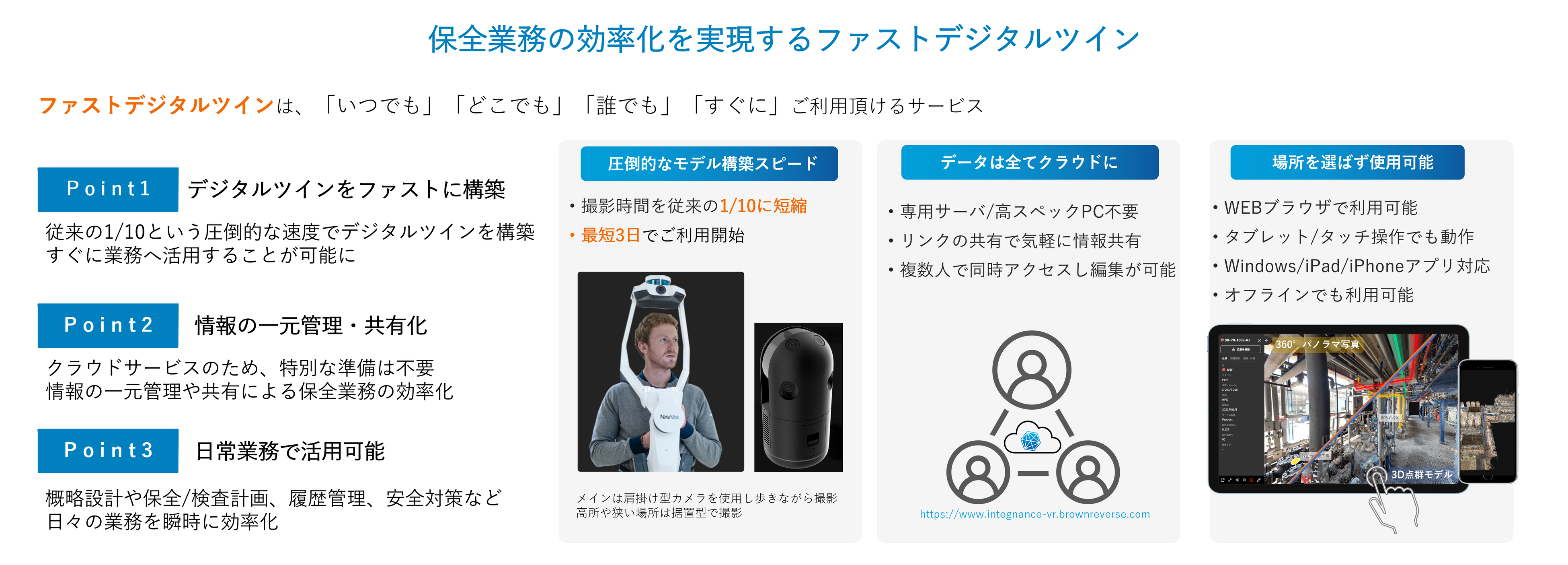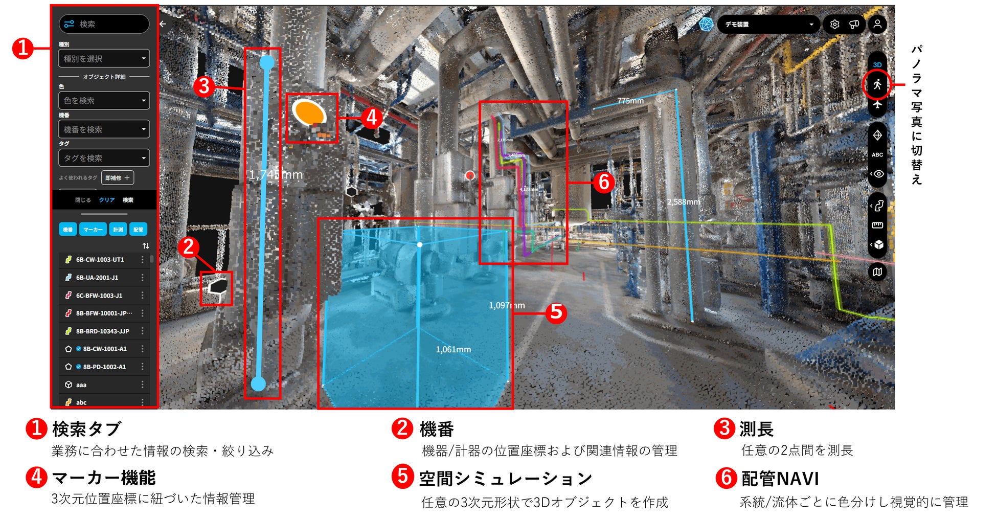 3次元情報をもった360パノラマ写真をベースに設備管理を手軽に一元化するための3次元ビューアサービスです。製造プラントにおける設備管理業務に活用しやすい様々な機能を実装しています。