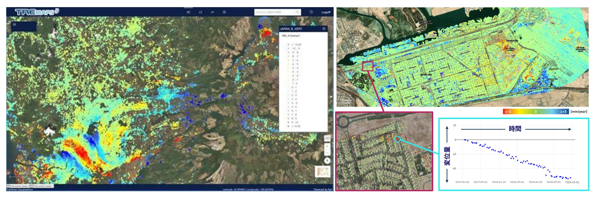 地盤変位量の解析結果と解析点での時系列グラフ(イメージ図)