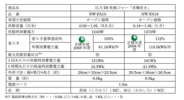 圧力IH炊飯ジャー「炎舞炊き」(NW-FA10・18) ニュースリリース