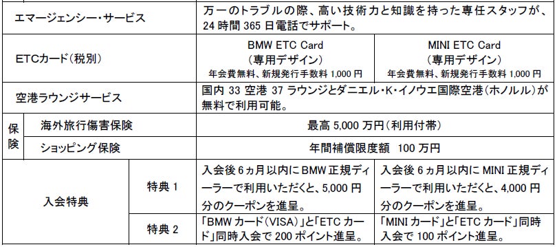 当社は同社と提携し、2005年から「MINIカード」を、2006年から「BMWカード(VISA)」をそれぞれ発行。「BMWカード(VISA)」はBMW正規ディーラーで、「MINIカード」はMINI正規ディーラーでキャッシュバックを受けられるお得なポイント制度のほか、空港ラウンジサービスやエマージェンシー・サービス(24時間365日電話サポート)などの付帯サービスが特長です(詳細は「参考資料」参照)。