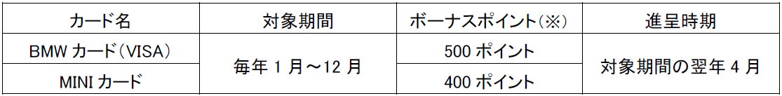 ・毎年1月から12月のショッピング利用金額合計50万円以上で年1回、ボーナスポイントを進呈します。