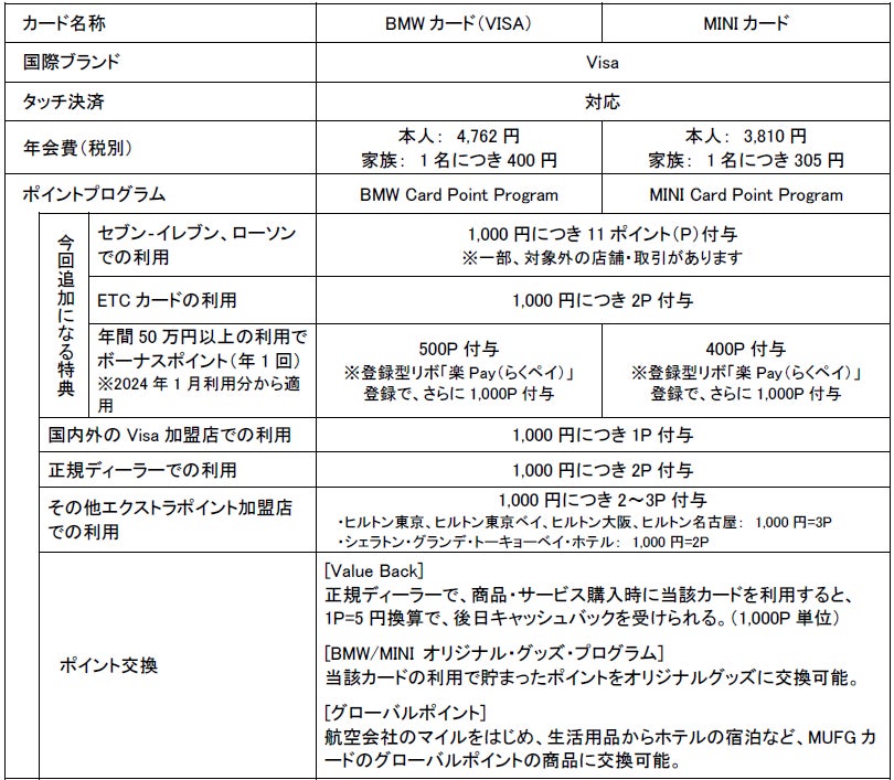 三菱UFJニコス、ビー・エム・ダブリュー・ジャパン・ファイナンスとの提携カード「BMWカード(VISA)」「MINIカード」でセブン‐イレブン・ローソンでのポイント優遇特典等を追加