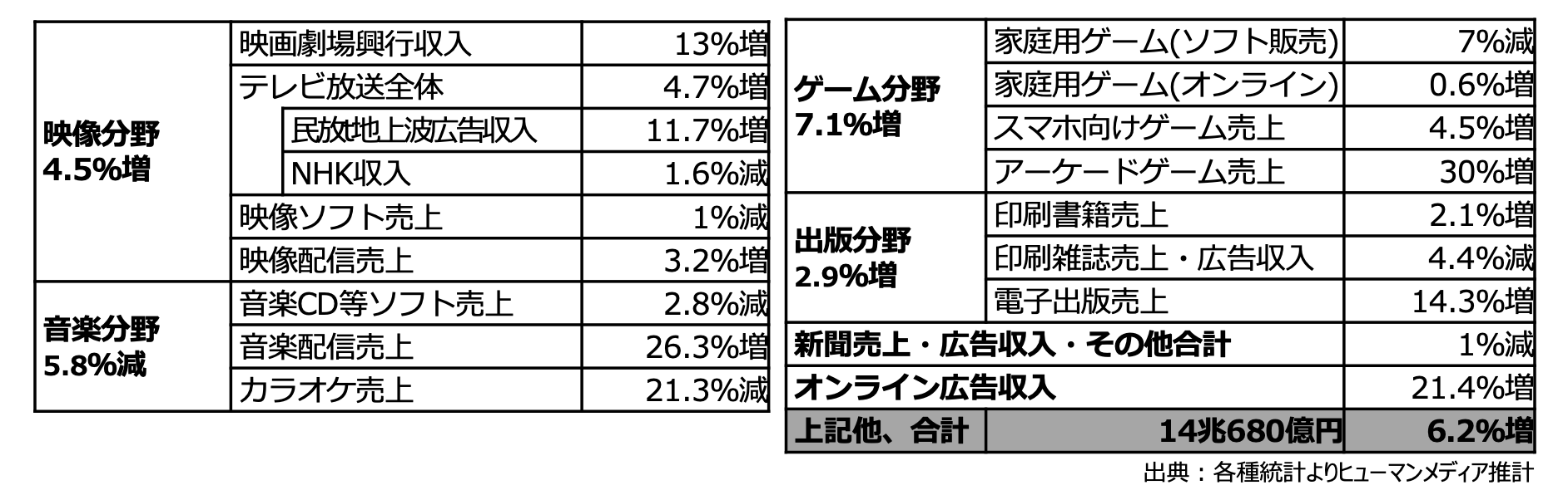 2021年の国内コンテンツ市場は前年比6.2%増の14兆680億円、コロナ禍で4.6%減となった2020年から回復、過去最大規模を記録。