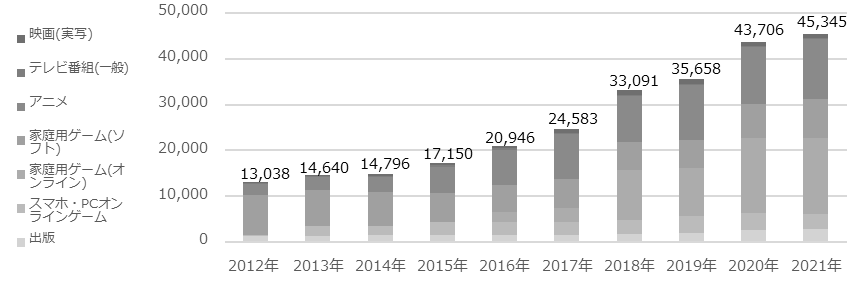 - 2021年の日本コンテンツの分野別海外市場規模と国内収入、2012年からの推移
