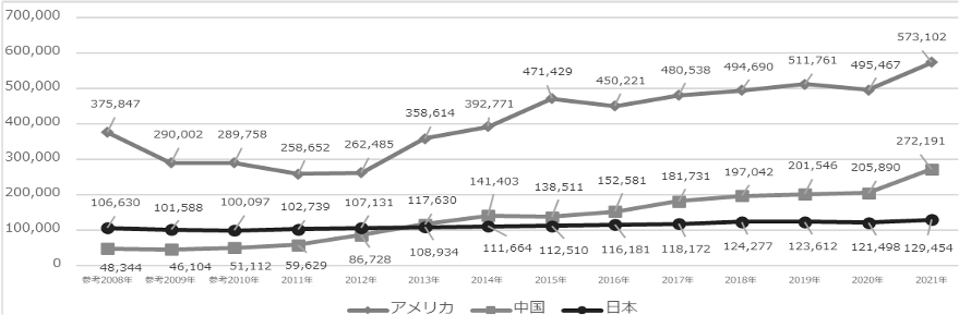 ●2008~ 2021年の米・日・中のメディア・コンテンツ市場規模の推移(単位:億円)