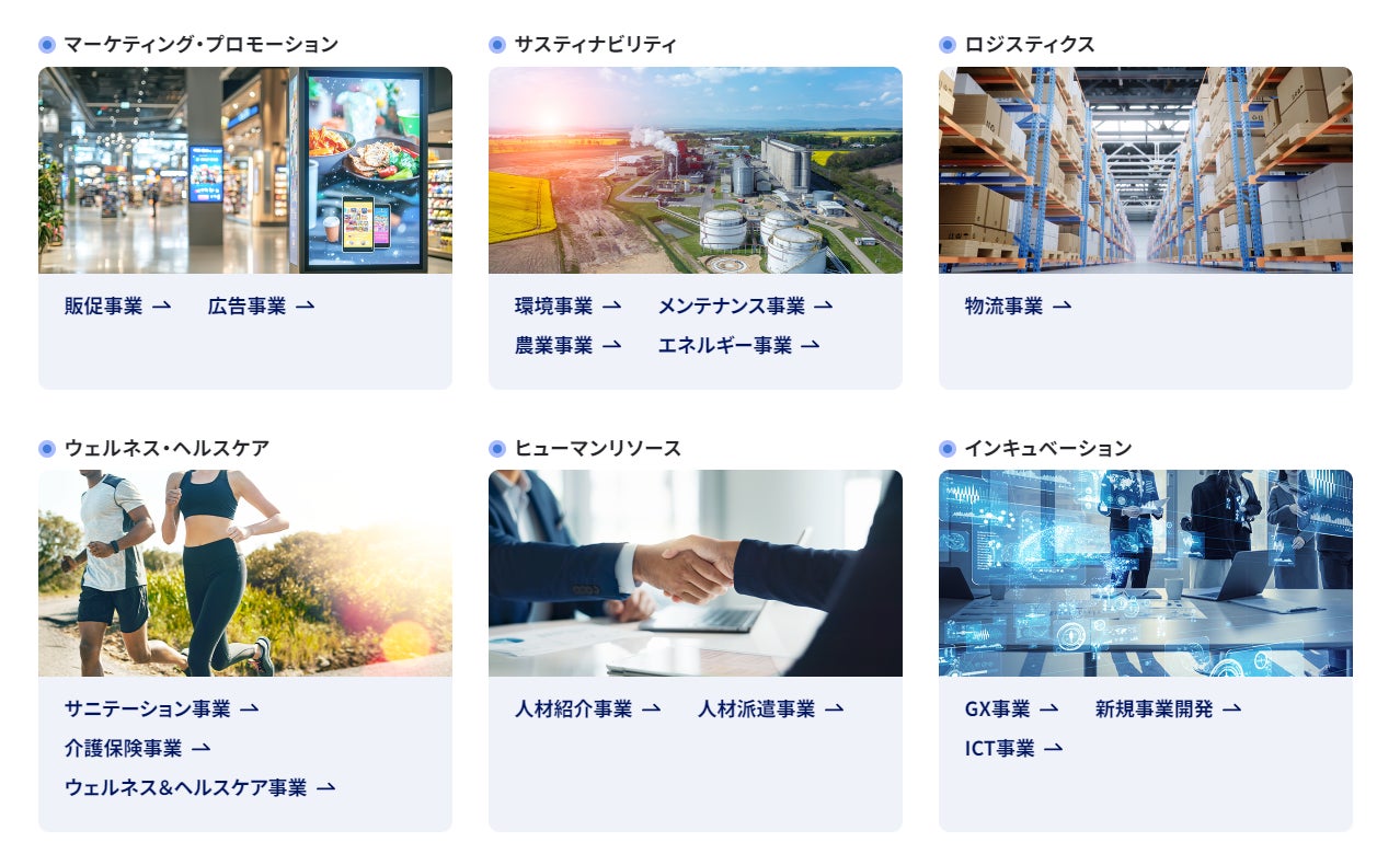 販促事業・広告事業・環境事業・メンテナンス事業・農業事業・ エネルギー事業・物流事業・サニテーション事業・介護保険事業・ ウェルネス&ヘルスケア事業・人材紹介事業・人材派遣事業・GX事業・ 新規事業開発・ICT事業 |