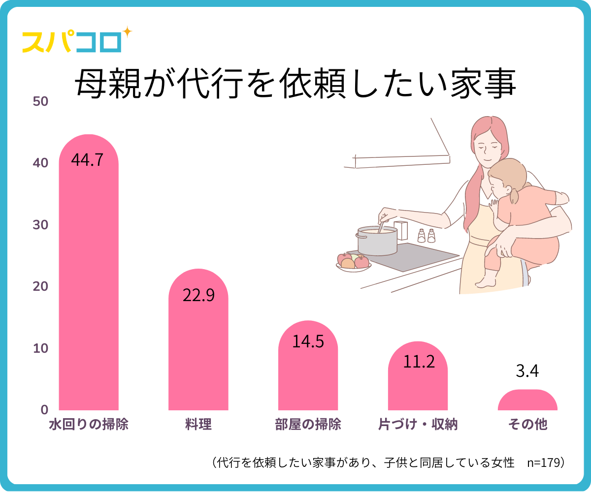 子供と同居している女性に絞ってみた際も順位は同様ですが、「水回りの掃除」が全体平均よりも12.2ポイント高く、約半数が依頼したいと思っているようです。