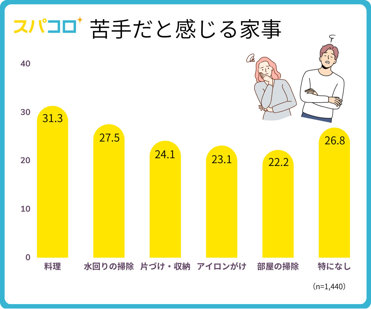 苦手な家事TOPは「料理」(31.3%)。子供と同居している女性の回答は「水回りの掃除」「片づけ・収納」「アイロンがけ」「部屋の掃除」いずれも全体平均より5ポイント以上高い。