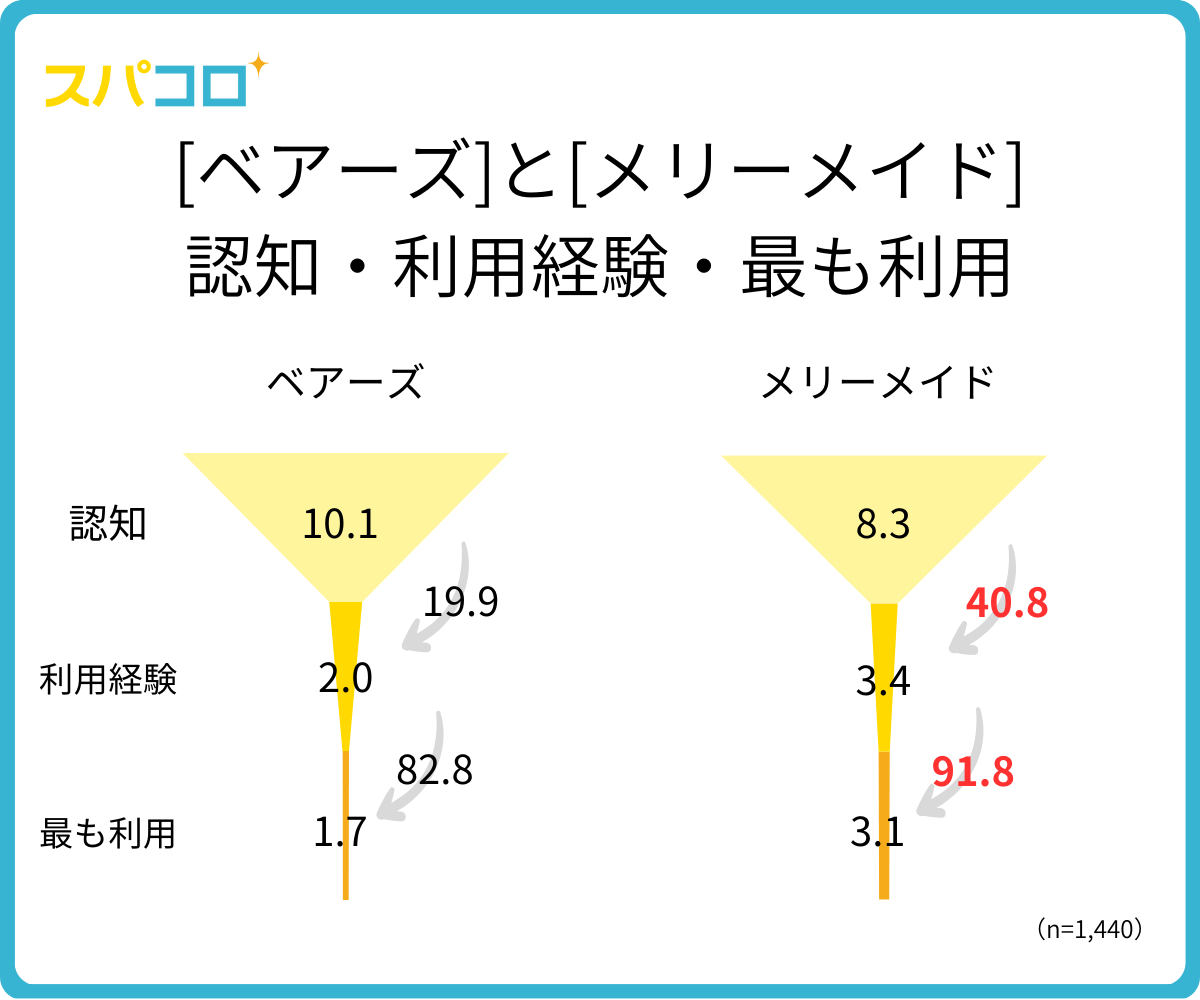 家事代行サービスで何かしらのサービスを知っている割合は約2割でした。その中で「ベアーズ」と「メリーメイド」を比較すると「ベアーズ」は認知率が1.8ポイント高いですが、利用経験率・最も利用している率は「メリーメイド」の方が約1.5ポイント高い結果となっており、認知してから利用者を獲得する割合は「メリーメイド」の方が高いことがわかります。
