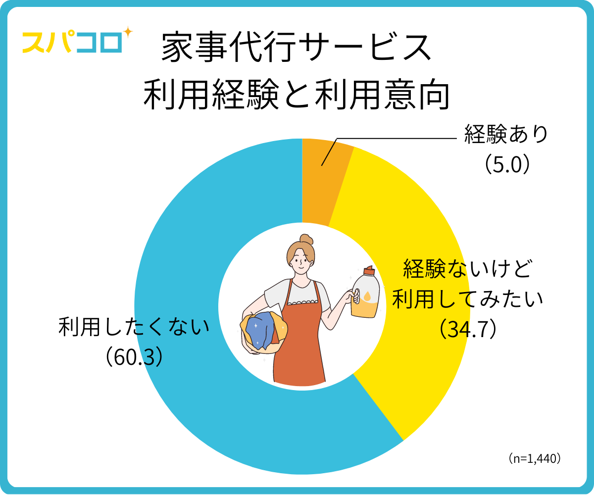家事代行サービスの利用経験と利用意向を聞いたところ、全体では「経験あり」が5.0%、「経験ないけど利用してみたい」(34.7%)、「利用したくない」(60.3%)でした。