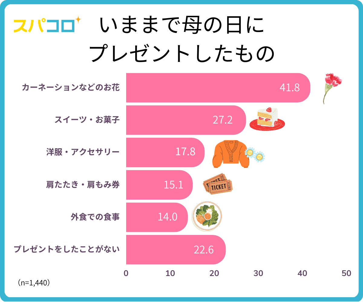 母の日のプレゼント経験、一番多かったものは「カーネーションなどのお花」(41.8%)。次いで「スイーツ・お菓子」、「洋服・アクセサリー」。
