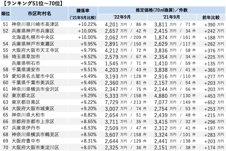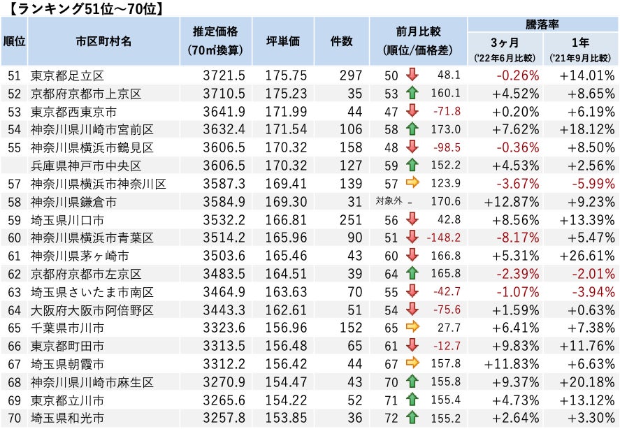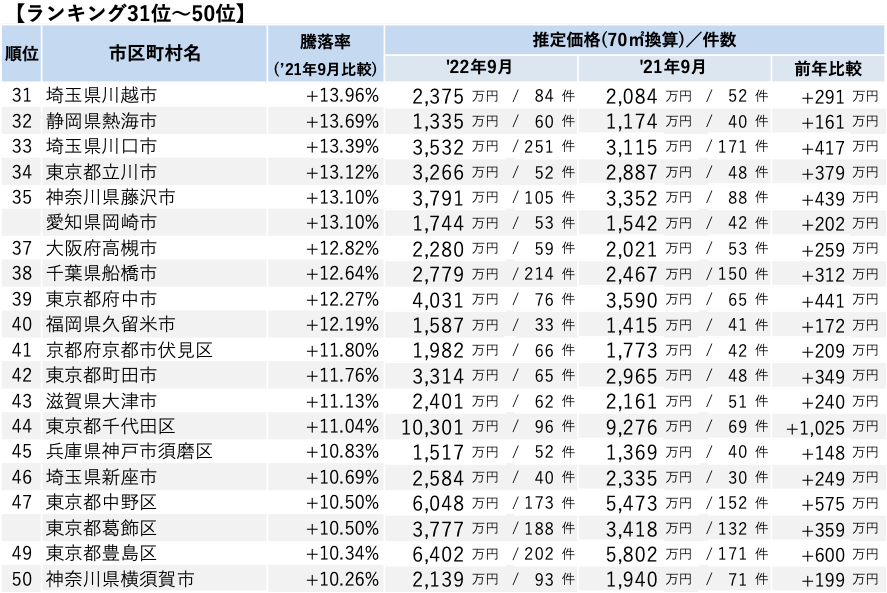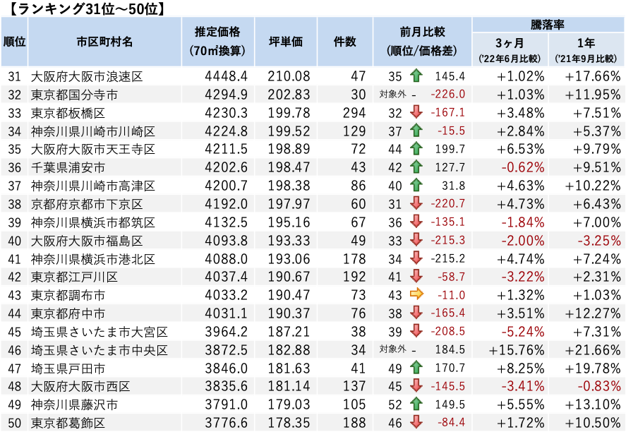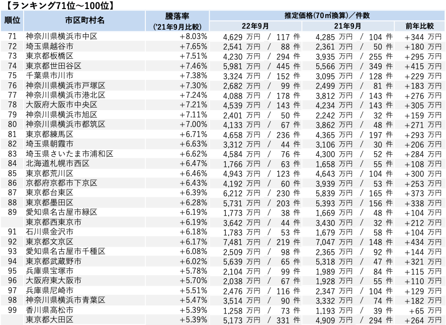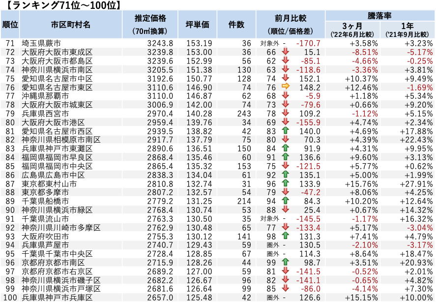 ・100位以内の市区で、前年(2021年9月)と比較して価格が上昇したのは87市区。なお、3ヶ月前(2022年6月)と比較して価格が上昇したのは75市区、前月と比較して価格が上昇したのは50市区。