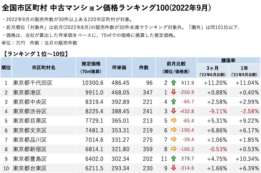「マンションレビュー」2022年9月 全国市区町村 中古マンション価格/騰落率ランキング100を発表