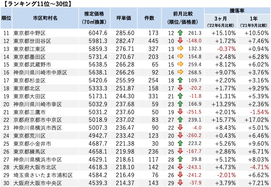 ・3位は「東京都中央区」。前月までは「東京都渋谷区」が3位だったが、9月は渋谷区が約430万円下落したため、中央区が3位となった。