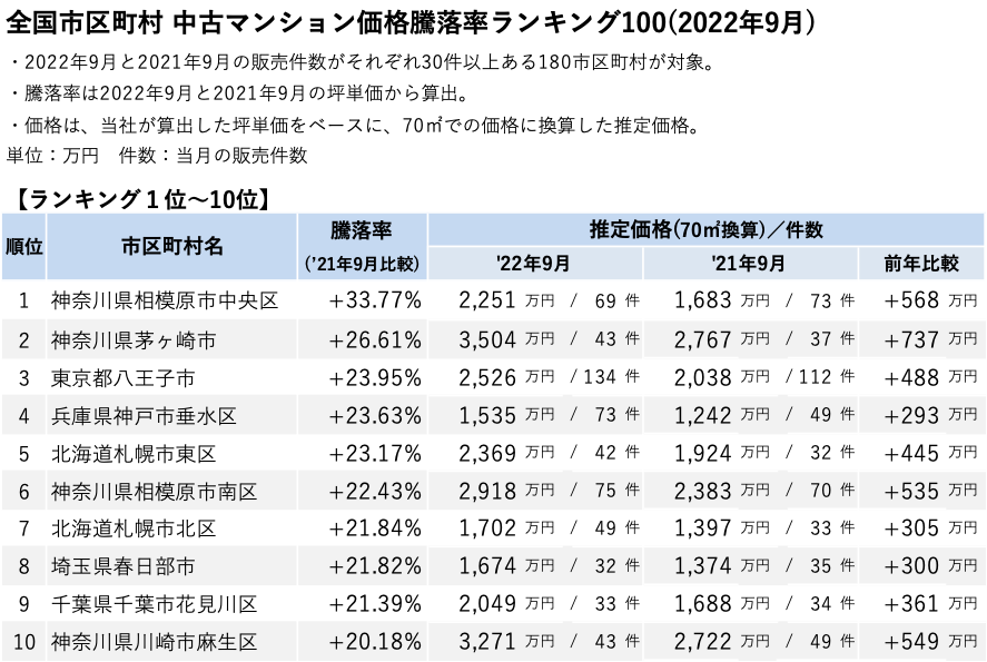 「不動産×WEB×ビッグデータ」の領域で、さまざまな不動産テックサービスを展開する株式会社ワンノブアカインド(本社:東京都港区、代表取締役社長:川島 直也、以下当社)は、当社が運営するマンション情報サイト「マンションレビュー」の保有データを元に、2022年9月の全国市区町村における中古マンションの相場を調査。坪単価をベースに70㎡での価格に換算した「中古マンション価格」*1および1年前と比較した価格の上昇率を表す「騰落率」のランキング100を発表いたします。