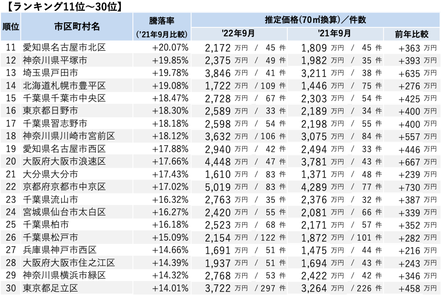 ※推定価格ランキングは2022年9月の販売件数が30件以上ある全国220市区町村、騰落率ランキングは2022年9月と2021年9月の販売件数がそれぞれ30件以上ある全国180市区町村が対象。