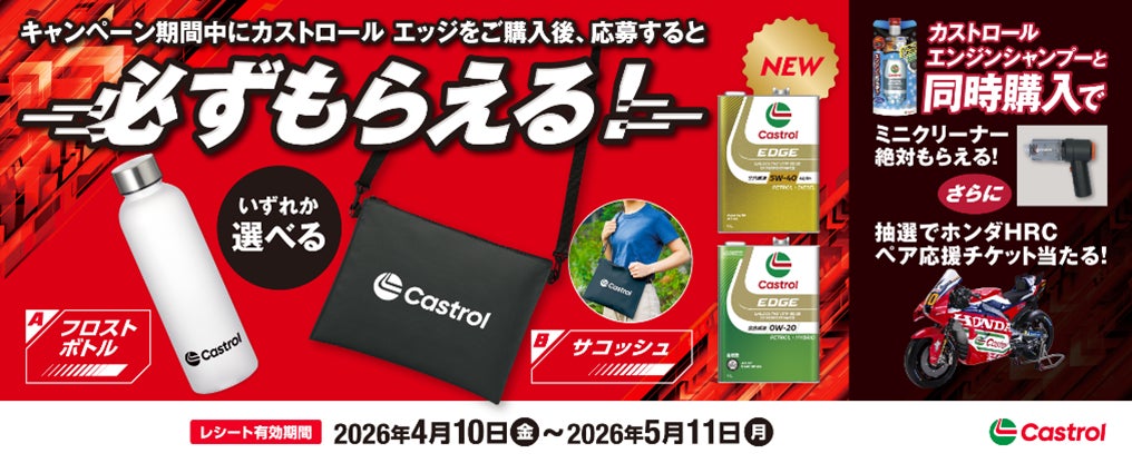 BPカストロール株式会社(東京都品川区、代表取締役社長:平川 雅規)は、エンジンオイル「カストロール エッジ」を購入して応募するとカストロールオリジナルグッズをプレゼントするカストロール エッジご購入のレシートで応募 絶対もらえるキャンペーン」を2026年4月10日(金)~2026年5月18日(月)*1まで実施いたします。