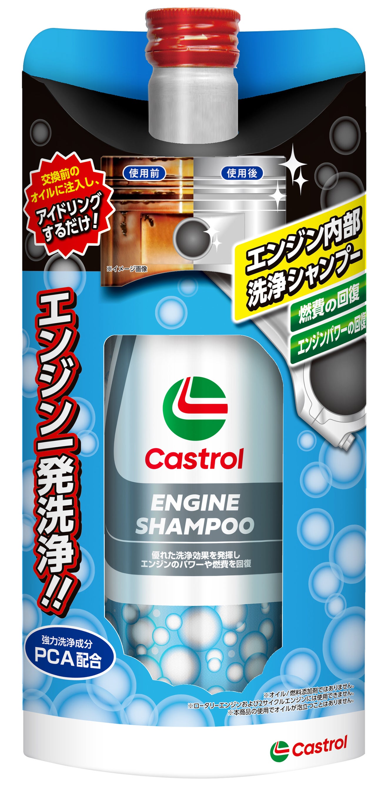 Castrol Engine Shampooは交換前のオイルに注入し、10分程度アイドリングするだけでエンジン内に堆積した頑固な汚れを浮き上がらせ、排出時にエンジン内部から取り除くことで、エンジンのパワーや燃費を回復します。