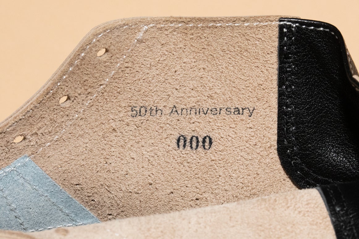 さらにソールテープやシューレースをあえて生成りにすることでヴィンテージ品のような雰囲気を演出し、ライニングにはアニバーサリーモデルを象徴するシリアルナンバーと生誕50周年を記念する「50th Anniversary」のテキストを押印したスペシャルな仕様が施されています。