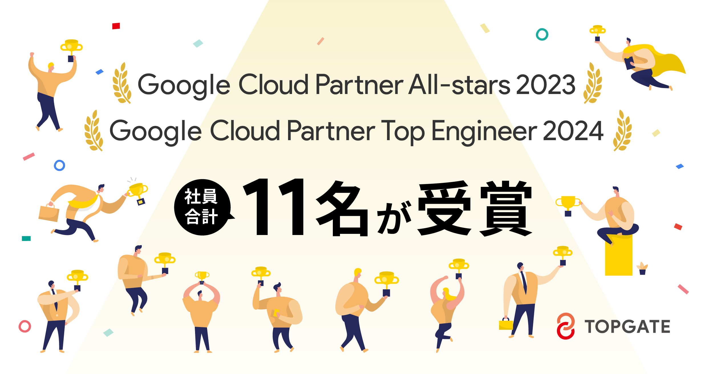 株式会社トップゲート(本社:東京都、代表取締役社長:大塩 啓行、以下「トップゲート」)は、この度、Google Cloud の Global プログラムである Google Cloud Partner All-stars 2023 および Google Cloud Japan の Google Cloud Partner Top Engineer 2024 で、当社の社員合計 11 名が受賞したことを発表いたします。