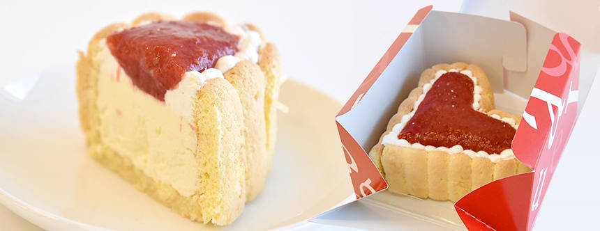 - 真っ赤なハートが目を引く、濃厚なチーズと手作りイチゴジャムの<特製シャルロットケーキ>
