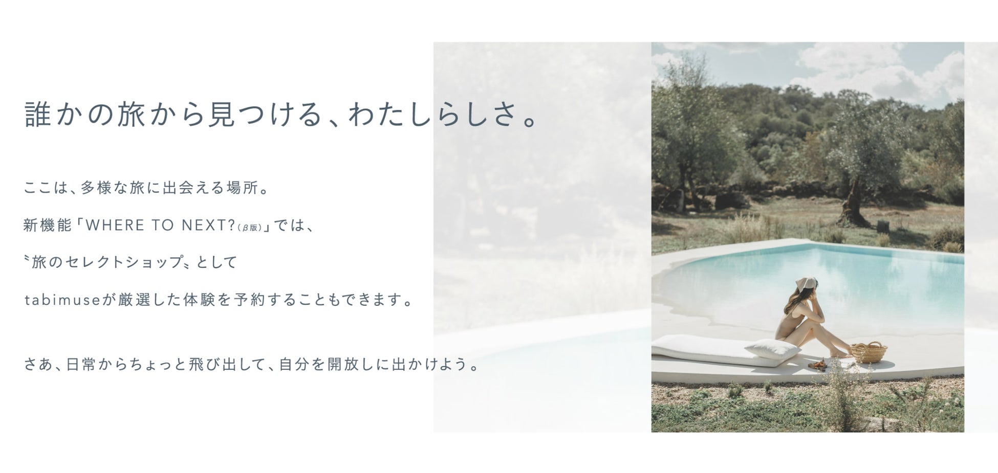 新機能となる「WHERE TO NEXT?」ではtabimuseが“旅のセレクトショップ”としてオリジナルの旅プランをプロデュースする他、厳選した体験を販売します。