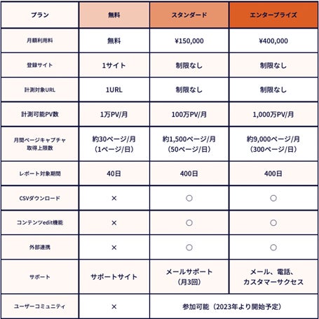 新料金プランでは、無料でContent Analyticsをご利用いただける「無料プラン」が登場。登録サイト数1サイト、計測対象URLも1URLとなりますが、Content Analyticsの基本的な解析機能が利用できます。ランディングページなどで特定ページでのご利用や、導入をお考えの際のお試しとしてもご利用いただけます。