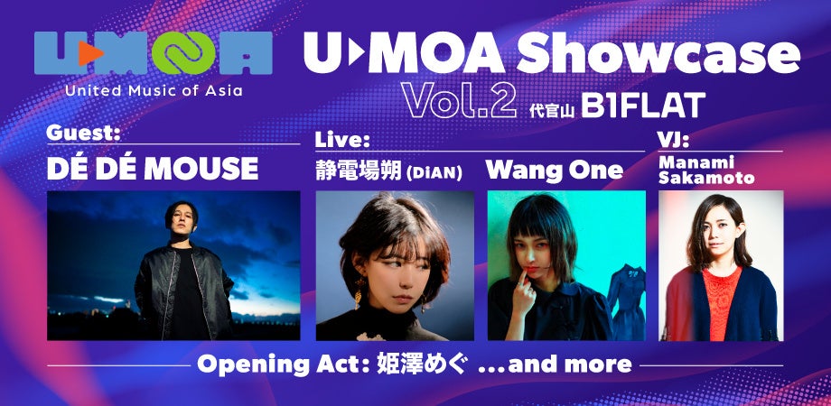 U/M/A/A Inc.は来たる12月15日(金)代官山「B1FLAT」にて、デビュー間近のエレクトロニック・ポップ・ユニット「Wang One」と中国のマルチ・クリエイター「静電場朔 (DiAN)」、そしてゲストに「DÉ DÉ MOUSE」をフィーチャーしたショーケース・イベント「U≫MOA Showcase vol.2」を開催いたします。DÉ DÉ MOUSEは自身のアジア・アーティストとのコラボ楽曲と、そのセンスでセレクトしたシティ・ポップや自身の曲をリエディットした”DÉ DÉ MOUSE Asian Disco Mix”のスペシャル・セットを披露予定。そしてオープニングアクトには現役大学生シンガー「姫澤めぐ」が登場。今年10月に恋愛リアリティ番組の出演で話題となり、日本と中国にルーツを持つ彼女がnote nativeプロデュース楽曲でその歌声を初披露!